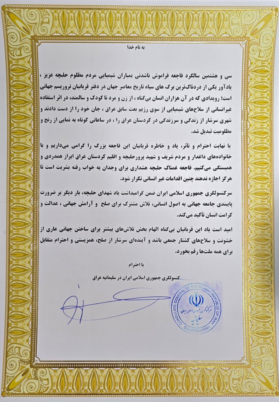 سەرکونسوڵگەری کۆماری ئیسلامی ئێران لە سلێمانی، لە ساڵیادی کیمیابارانکردنی هەڵەبجەدا پەیامێکی بڵاوکردووەتەوە و تێیداهاتووە: بە ئەوپەڕی ڕێز و خەمەوە، یاد و یادەوەریی قوربانیانی ئەم کارەساتە گەورەیە بەرز ڕادەگرین و هاوسۆزی و سەرەخۆشی خۆمان ئاراستەی بنەماڵە داغدارەکان و خەڵکی شەریف و شەهیدپەروەری هەڵەبجە و هەرێمی کوردستانی عێراق دەکەین.