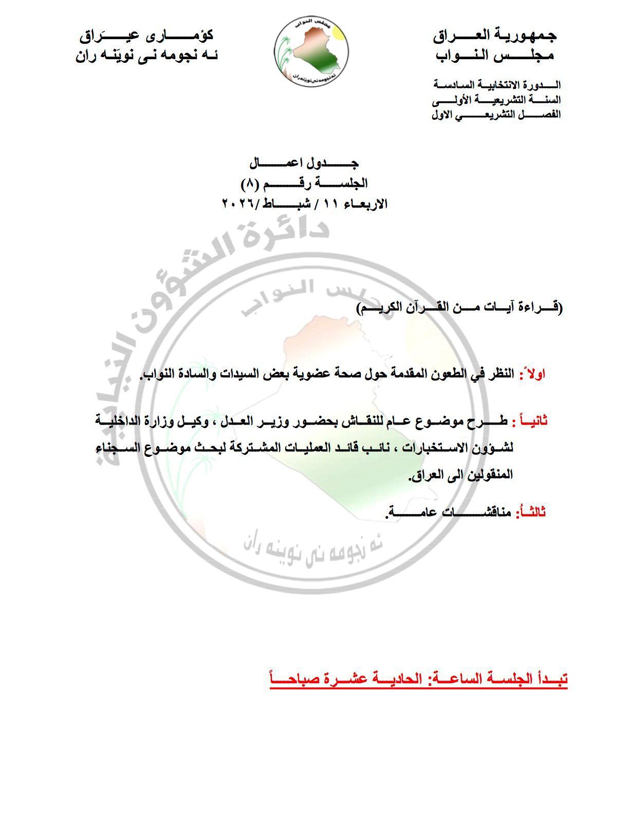وقالت الدائرة، في بيان تلقاه موقع كوردسات عربية: إن "جدول أعمال جلسة يوم غد الأربعاء يتضمن ثلاث فقرات: الأولى النظر في الطعون المقدمة حول صحة عضوية بعض النواب".