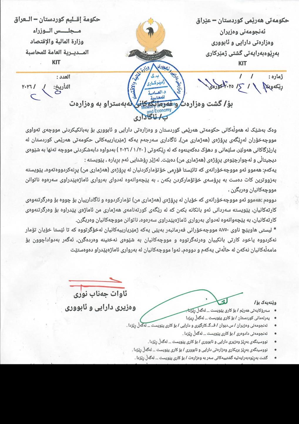 وەزارەتی دارایی و ئابووری حکومەتی هەرێمی کوردستان بڕیارێکی نوێی سەبارەت بە شێوازی دابەشکردنی موچەی فەرمانبەران دەرکرد و رایگەیاند, کە پڕۆسەی پێدانی موچە بە نەختینە (کاش) نەماوە و لە 20ی 1ـی2026وە بە دیجیتاڵی دەبێت.